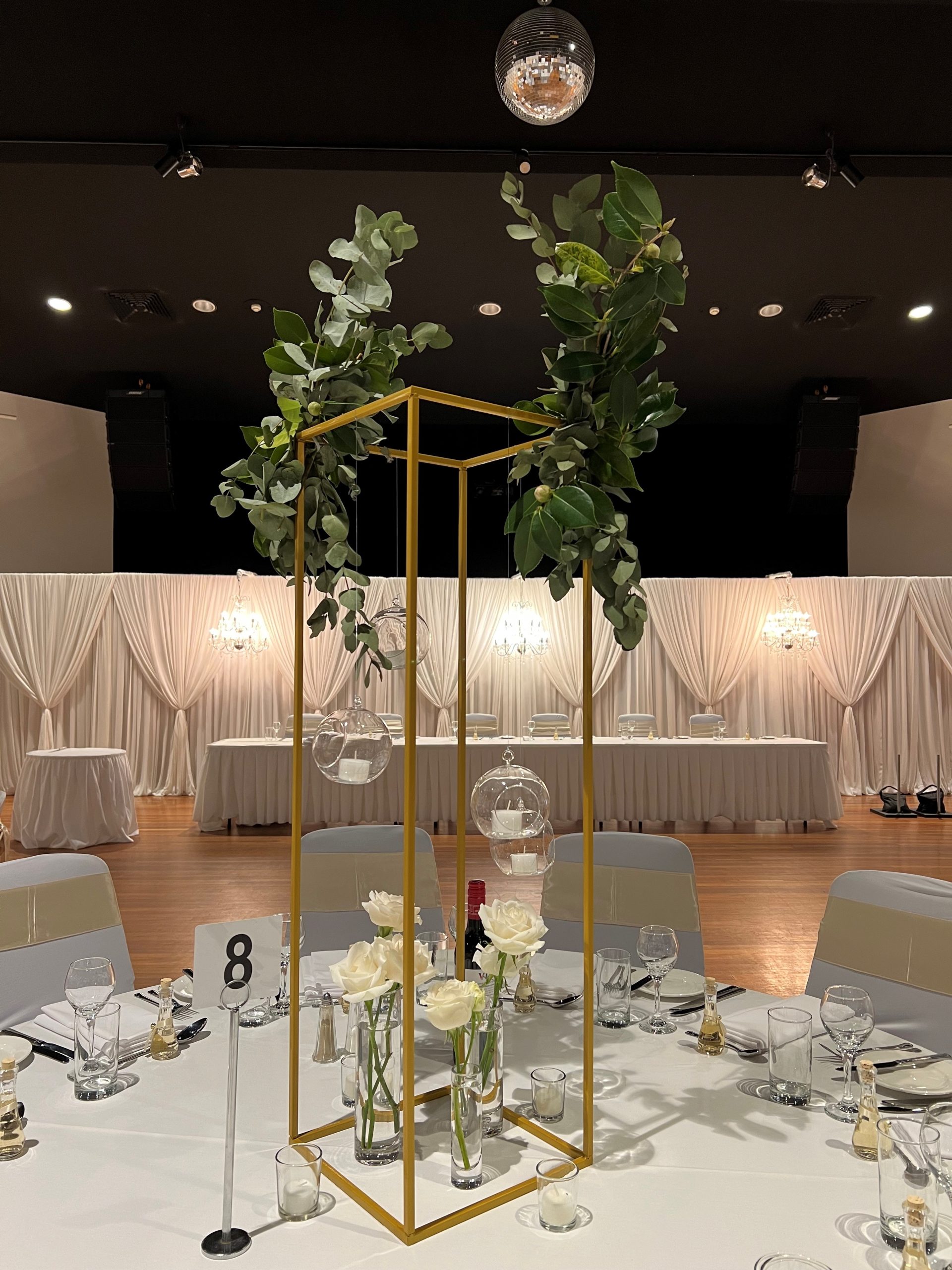Tall metal stand with fresh foliage, hanging glass baubles, bud vases with blooms and tea light candles